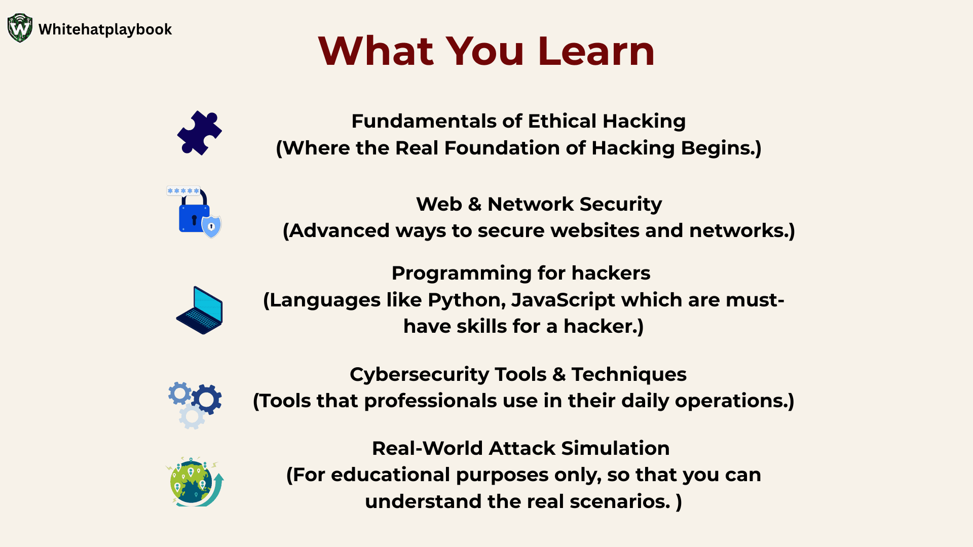 That’s why WhiteHatPlaybook has another simple goal – to make ethical hacking and cybersecurity and programming simple, beginner-friendly and practical.